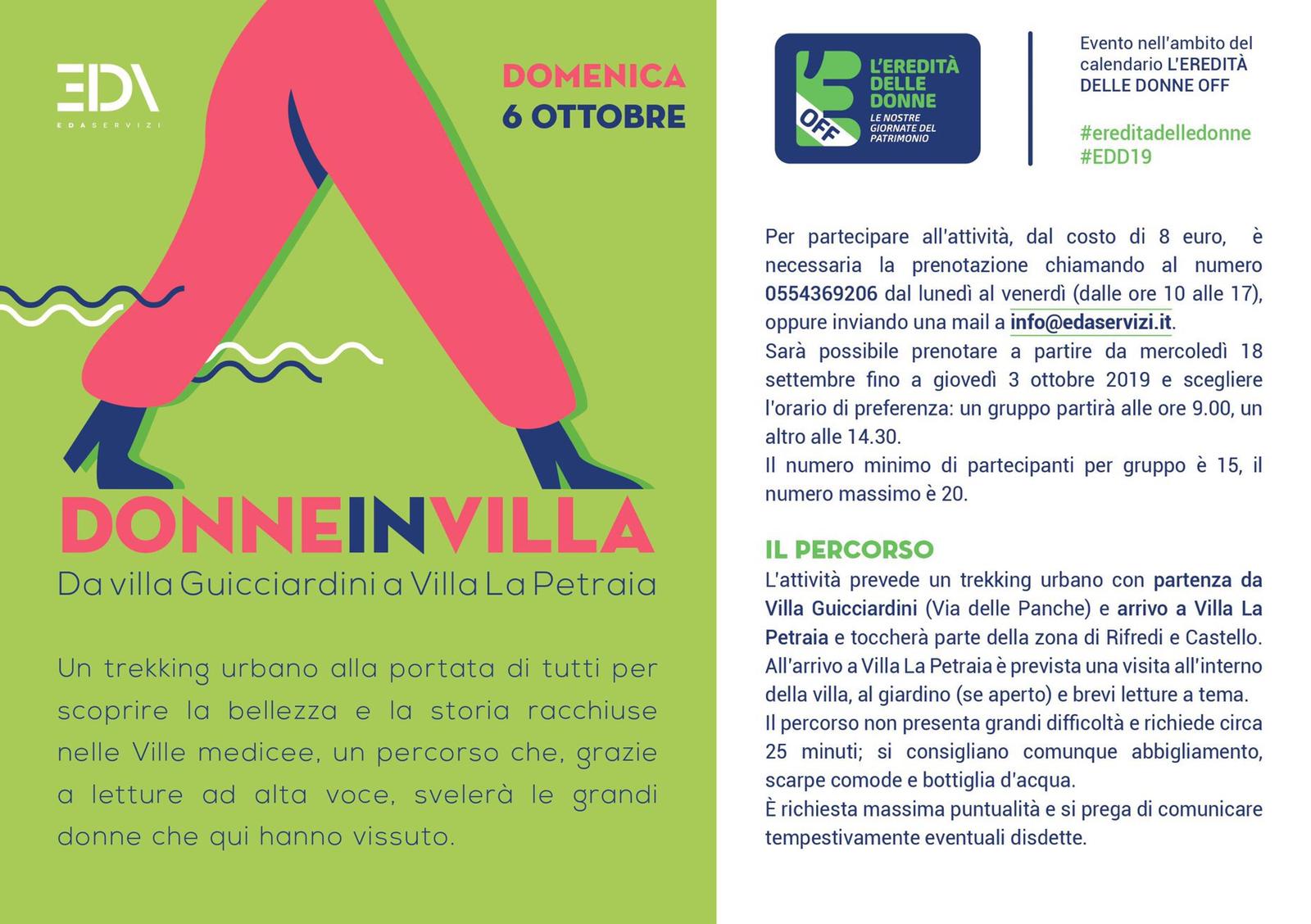 “Sarà una piacevole domenica da passare in compagnia di persone che apprezzano l’arte e la storia e sono curiose di scoprire luoghi "off" della nostra città come le ville medicee – commenta la presidente di Eda Servizi Francesca Caderni – Siamo felici di partecipare con questo progetto culturale al Festival diretto da Serena Dandini pensato anche per rileggere il patrimonio artistico e culturale di Firenze e per valorizzare il punto di vista delle donne".