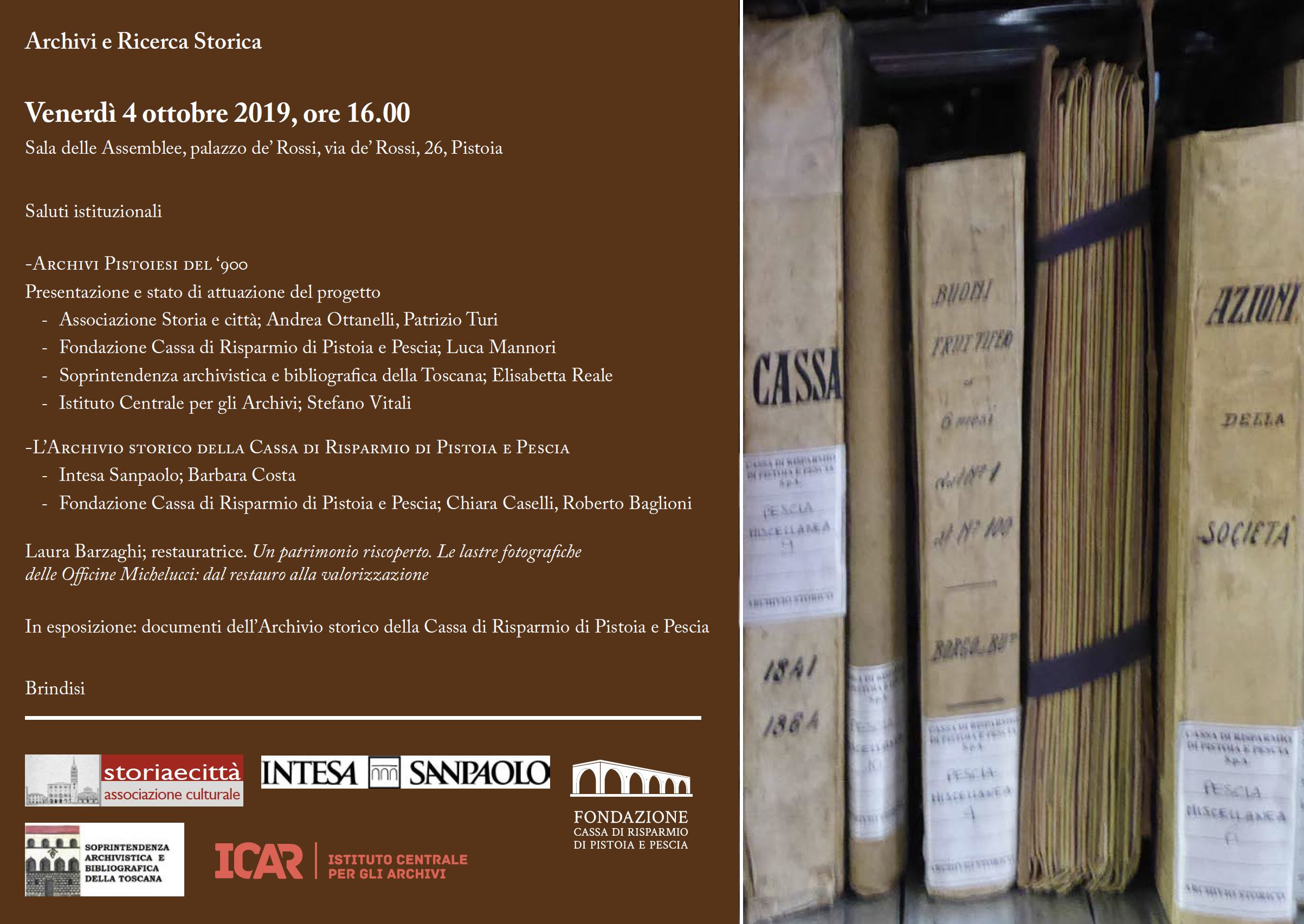 L’incontro è anche l’occasione per restituire alla città uno dei suoi più importanti archivi. Infatti è stato recentemente raggiunto l’accordo con cui Intesa Sanpaolo ha conferito alla Fondazione Cassa di Risparmio di Pistoia e Pescia l’intero Archivio storico della Cassa di Risparmio di Pistoia e Pescia. L’operazione è stata condotta nell’ambito delle iniziative di tutela e di valorizzazione dei patrimoni archivistici delle banche territoriali presenti in Intesa Sanpaolo; il progetto di recupero, curato dall’Archivio storico di Intesa Sanpaolo, ha permesso portare alla luce nuclei di documenti fino ad ora sconosciuti, estremamente significativi per la storia del territorio pistoiese.