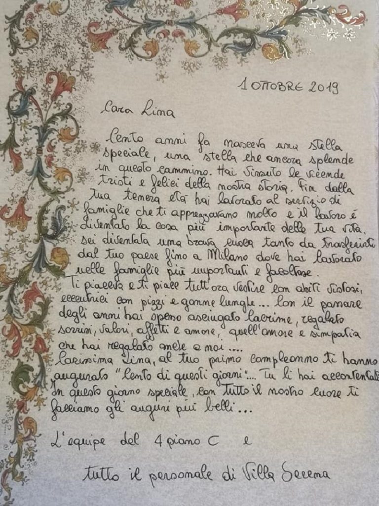 A portare gli auguri alla centenaria è stato anche il sindaco di Montaione Paolo Pomponi: "Lina è una signora irpina, di umili origini, che nella vita è riuscita a diventare una cuoca molto apprezzata, svolgendo con successo la sua professione in varie città, in particolare a Milano. Donna precisa e puntuale e con un carattere molto determinato e tuttora fisicamente in discreta firma e di grande lucidità. E con grande piacere oggi ho portato a Lina il saluto della comunità montaionese e un omaggio floreale. È sempre una grande emozione incontrare e dialogare con una persona che ha vissuto un secolo intero!", queste le parole del primo cittadino.