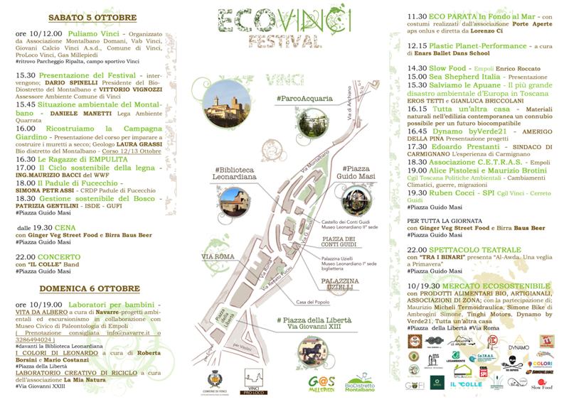 EcoVinci Festival, la manifestazione per l'ambiente e la sostenibilità organizzata da Proloco Vinci, Biodistretto del Montalbano e Gas Millepiedi Cerreto-Vinci, torna per la seconda edizione. Il 5 e 6 ottobre la grande festa della “Natura Maestra de' Maestri”, che ha il patrocinio del Comune di Vinci e coinvolge come da tradizione gran parte delle associazioni del territorio, renderà le strade del centro storico della città di Leonardo protagoniste dell’intrattenimento legato ai temi dell'ecologia, del risparmio energetico e della tutela del territorio.