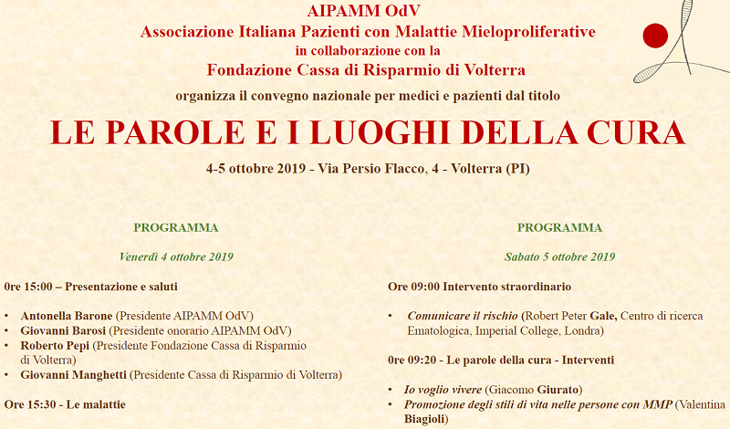Pazienti, ematologi, psicologi e altri esperti s’incontrano a Volterra il 4 e 5 ottobre 2019 - presso il Centro Espositivo "Santa Maria Maddalena della Fondazione Cassa di Risparmio, Via Persio Flacco ,2 - per parlare di Malattie Mieloproliferative Croniche Ph (MMP) e di come è cambiato negli ultimi anni l’approccio terapeutico a questo gruppo di neoplasie ematologiche rare.