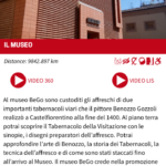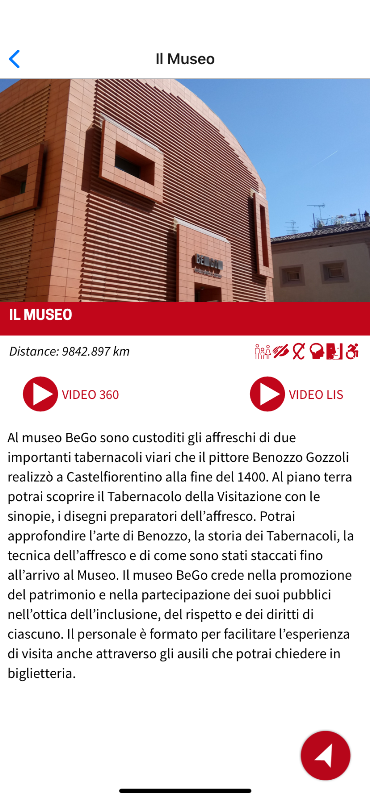 - Coinvolgimento del pubblico sordo: di supporto ai già presenti video con sottotitoli, il BeGo ha ideato Benozzo GozzoLIS, l’audio-video guida in LIS, completa di sottotitoli e audio distribuita gratuitamente su tablet al desk dell’accoglienza, grazie al quale è possibile conoscere le opere di Benozzo Gozzoli.