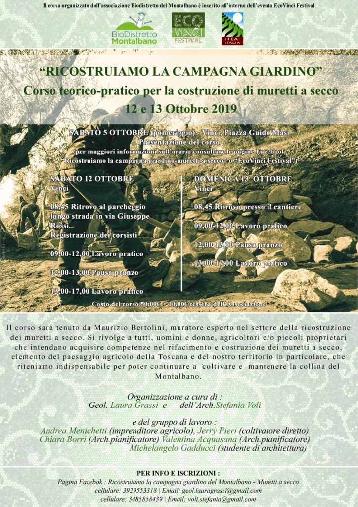 Oggi, 5 ottobre, alle ore 16, nell'ambito dell'Ecovinci Festival verrà presentato l'ottavo corso per la ricostruzione dei muretti a secco a cura del gruppo di lavoro "Ricostruiamo la campagna giardino" dell'Associazione BioDistretto del Montalbano