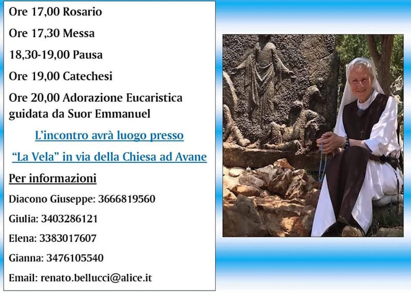 Un importante evento religioso è in programma domenica prossima presso la Vela 'Margherita Hack' di Avane. Don Renato Bellucci, parroco della frazione oltre che di Pagnana e Riottoli, ha infatti organizzato un incontro con Suor Emmanuel, la religiosa che fa parte della 'Comunità delle beatitudini' di Medjugorje, la città bosniaca famosa per le apparizioni mariane. Si tratta di un personaggio conosciuto ed apprezzato a livello internazionale visto che la suora, che vive ormai dal dicembre del 1989 nella cittadina bosniaca dove fa parte dell'associazione "Children of Medjugorje", è diventata una vera e propria messaggera nel mondo dei messaggi mariani. Ricevuta nel 1996 anche da Papa San Giovanni Paolo II, visita i più importanti luoghi di culto e le città più grandi delle varie nazioni ed è anche per questo che averla ospite in città assume, per i credenti, l'aspetto di un vero e proprio evento. L'incontro di domenica inizierà alle 17 con il Rosario guidato dalla stessa Suor Emmanuel e proseguirà con la Messa e la catechesi. Al termine, attorno alle 20, l'Adorazione sempre guidata dalla religiosa.