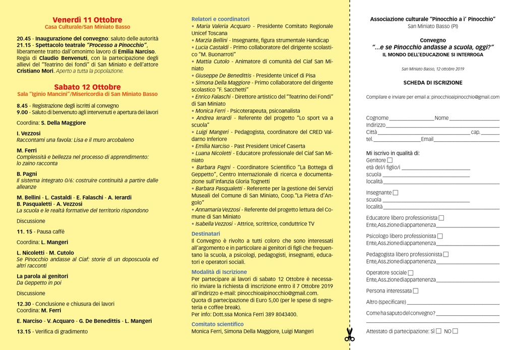 Il convegno si apre venerdì 11 alle ore 20,45 presso la Casa culturale di S.Miniato Basso con lo spettacolo teatrale 'Processo a Pinocchio', liberamente tratto dall'omonimo lavoro di Emilia Narciso, past president Unicef di Caserta che sarà presente all’evento. La regia è stata affidata a Claudio Benvenuti con la partecipazione degli allievi del “Teatrino dei fondi” di San Miniato e dell’attore Cristiano Mori. Lo spettacolo è gratuito e aperto a tutta la popolazione. La frazione di San Miniato Basso è stata scelta appositamente per il suo legame a doppio filo con il romanzo di Carlo Collodi, tanto da aver ispirato allo scrittore il nome del burattino bugiardo.