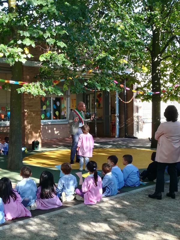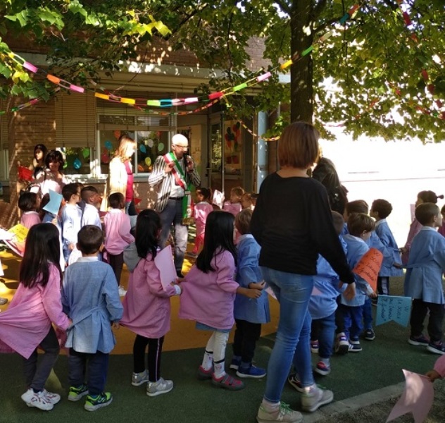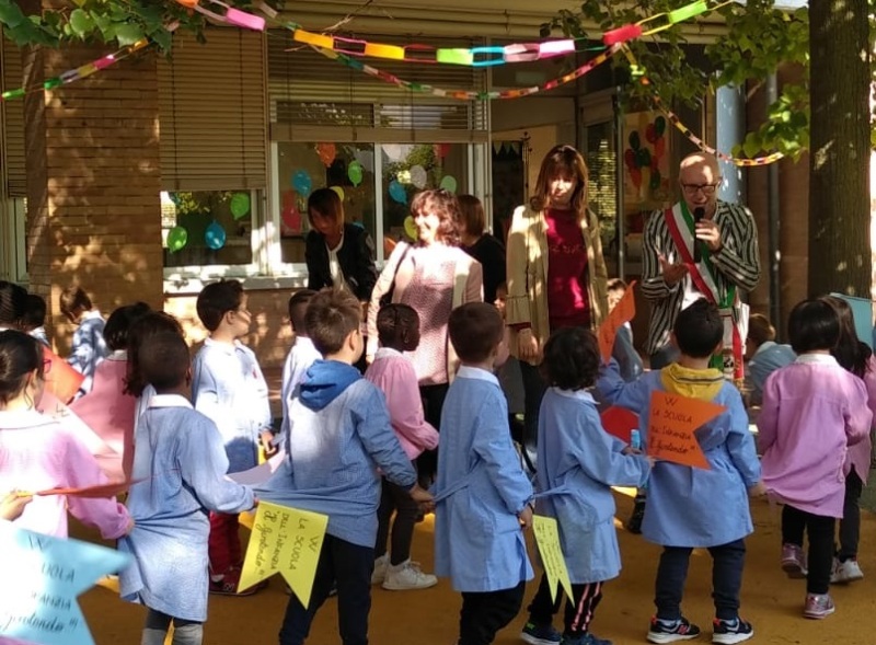 Bambini, insegnanti e amministrazione comunale insieme per festeggiare il nuovo giardino della scuola dell’infanzia “Il Girotondo” di via Trento.