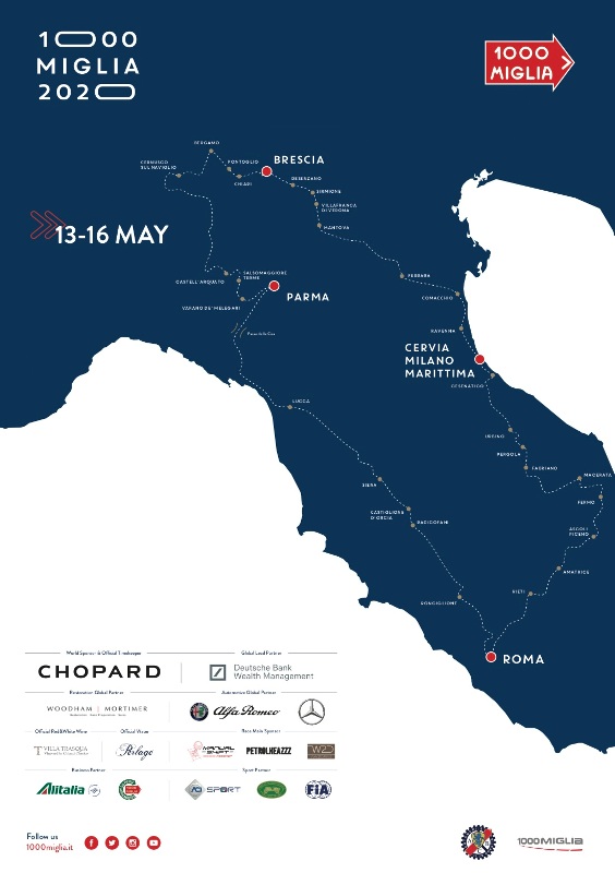 La 1000 Miglia partirà da Brescia mercoledì 13 maggio, attraverserà luoghi suggestivi come Lago di Garda, Desenzano e Sirmione e passerà da Villafranca di Verona, Mantova, Ferrara e Ravenna per concludere la tappa a Cervia-Milano Marittima. Il giorno seguente sarà la volta della tratta Cesenatico - Urbino, poi Fabriano, Macerata, Fermo, Ascoli Piceno e Amatrice. Da Rieti, il corteo storico proseguirà alla volta di Roma, dove concluderanno la seconda giornata di corsa. Il terzo giorno, venerdì 15, è quello dell'arrivo a Lucca: le vetture toccheranno in suc-cessione Ronciglione, Radicofani, Vitermo, Castiglione d'Orcia, Siena e poi, appunto Lucca. Proseguiranno per il Passo della Cisa fino a Parma, dove sosteranno la notte. Sabato 16, quarto e ultimo giorno, dopo Salsomaggiore Terme, Castell'Arquato, Cernusco sul Naviglio, Bergamo ecco che le vetture faranno il loro ingresso trionfale a Brescia, dove tutto ebbe inizio, ben 93 anni fa.