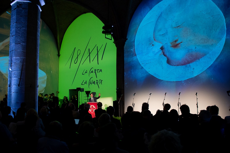 Alla Carta 18-XXI, cui ha dato per primo impulso il Théâtre de la Ville con il suo direttore Emmanuel Demarcy-Mota, hanno aderito altissime personalità, tra cui l’astrofisico Jean Audouze, il Rettore dell’Académie de Paris e della regione accademica dell’Ile-de-France Gilles Pécout e quello dell’Università di Firenze Luigi Dei, il Presidente dell’Accademia di Belle Arti di Firenze Carlo Sisi, il neurobiologo Stefano Mancuso. L’impegno comune per tutti quanti sottoscrivono la Carta 18-XXI è: agir, faire, créer, au maximum de leur capacitée: travailler pour les autres (agire, fare, creare, al massimo delle loro capacità: lavorare per gli altri). Il documento è stato letto da 20 liceali, 10 provenienti dal Liceo Montaigne di Parigi (nell’ambito della stagione franco-italiana dell’Académie de Paris), 10 dal Liceo Linguistico Internazionale Machiavelli-Capponi di Firenze. Sono loro i “18-XXI”, i primi figli del Duemila che si sono cimentati anche in brani di Victor Hugo, Albert Camus, Giacomo Leopardi e Lorenzo de’ Medici, mentre i Nuovi, i diplomati della Scuola per Attori “Orazio Costa” del Teatro della Pergola, hanno letto un passo del Manifesto di Ventotene.