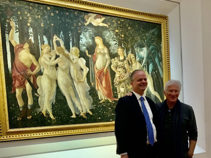 L' ‘Ufficiale e gentiluomo’ Richard Gere ‘in missione’ agli Uffizi. Il celebre attore statunitense, oggi a Firenze per ricevere dal sindaco Dario Nardella le Chiavi della Città nell'ambito di una cerimonia in Palazzo Vecchio, è stato nel primo pomeriggio in visita alla Galleria delle Statue e delle Pitture. Circa un'ora la durata del tour tra i capolavori del museo, condotto dal direttore Eike Schmidt. Gere, che ha firmato autografi e voluto anche una foto di gruppo con i dipendenti degli Uffizi accorsi ad accoglierlo insieme al direttore, ha ammirato in particolare la pala di Ognissanti di Giotto, il doppio ritratto dei Duchi di Urbino, la Primavera del Botticelli, l'Annunciazione di Leonardo ed il Tondo Doni di Michelangelo. "Gere è un visitatore davvero attento e curioso - ha detto Schmidt al termine del tour - si è soffermato su ogni opera, studiando con pazienza i dettagli e facendo molte domande. Ha apprezzato moltissimo la Tebaide del Beato Angelico, sottolineando la somiglianza tra le figure dei santi padri in ritiro ascetico nel deserto ed i monaci buddisti tibetani".