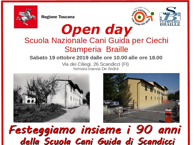 Open day della Scuola Nazionale Cani Guida per Ciechi e della Stamperia Braille sabato 19 ottobre 2019 dalle 10 alle 18, nella sede di via dei Ciliegi 26 a Scandicci (fermata tramvia De Andrè). “E’ un anno particolare per la Scuola Cani Guida di Scandicci, perché festeggia i suoi 90 anni – dicono i promotori dell’Open day - è una ricorrenza importante, soprattutto se pensiamo che la Scuola di Scandicci è la più vecchia al mondo insieme alla scuola statunitense Seeing eye, anch’essa nata nel lontano 1929. L’Open day, quindi, sarà anche un’occasione per festeggiare le novanta candeline assieme a tutti coloro che interverranno”. Per l’Open day sono in programma dimostrazioni del metodo di addestramento “gentile” dei cani guida da parte degli istruttori, oltre a momenti dedicati all’illustrazione dei progetti della Scuola, in modo particolare del programma affidamento dei cuccioli e delle attività più significative della Stamperia Braille; al mattino anche giochi a premi per bambini. Nel pomeriggio alle 16 un monologo comico. La Scuola Nazionale Cani Guida per Ciechi e la Stamperia Braille sono servizi della Regione Toscana. Il programma.