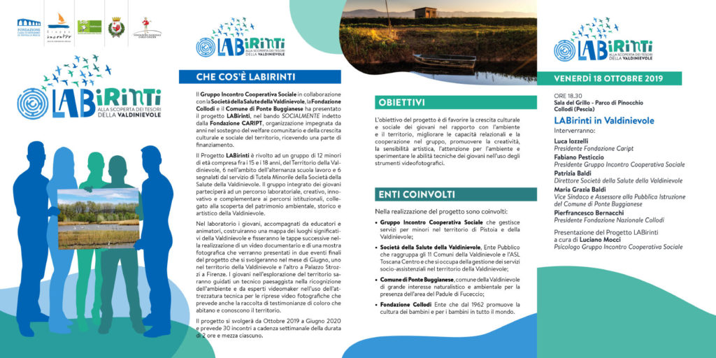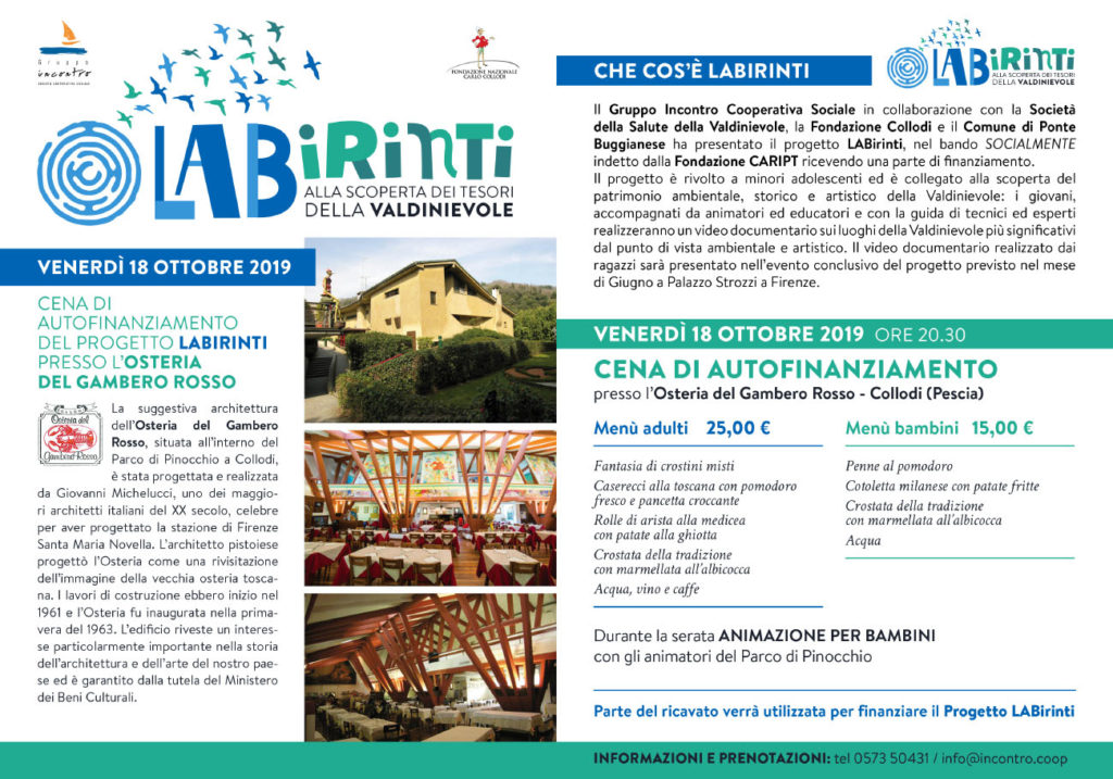 Sono ancora aperte le iscrizioni alla cena per finanziare il progetto LABirinti – alla scoperta della Valdinievole, serata organizzata da il Gruppo Incontro cooperativa sociale e la Fondazione Nazionale Carlo Collodi, in programma dalle 20.30 di venerdì 18 ottobre all’Osteria del Gambero Rosso, via San Gennaro 3 – 51012 Collodi (Pescia – PT). Il progetto è rivolto a un gruppo di 12 minori di età compresa tra i 15 e i 18 anni: 6 nell’ambito dell’alternanza scuola-lavoro e altri 6 segnalati dal servizio tutela minorile della Società della Salute della Valdinievole che insieme alla Fondazione Collodi e al Comune di Ponte Buggianese collaborano con il Gruppo Incontro. Il progetto è in parte finanziato dalla Fondazione Caript attraverso il bando SOCIALMENTE.