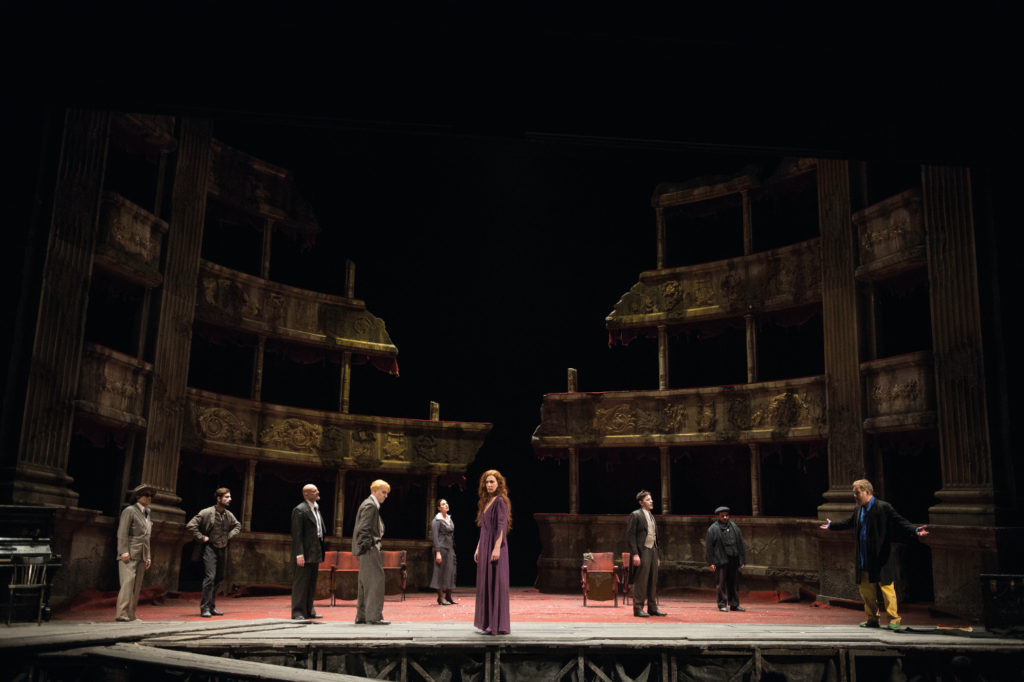 Certo, sono gli uomini del fare, mentre il teatro è fatto dagli uomini dell’essere. Luigi Pirandello l’aveva capito molto bene. Perciò, ho voluto come scenografia un teatro distrutto. Distrutto perché ci vogliono costruire degli uffici per organizzare un teatro che non c’è, è morto, ucciso proprio dagli uffici. I Giganti è un testo profetico, di cui l’autore non scrisse mai il III e ultimo atto, perché non fece in tempo.