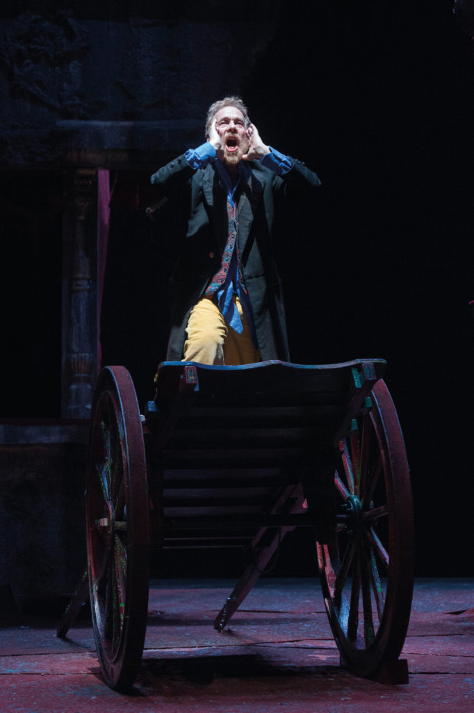 “Pirandello vive con I giganti della montagna il suo grande momento espressionista. Si tratta di un espressionismo onirico, fantastico, visionario. Alcuni attori – spiega l’attore e regista nel programma di sala – si sono ridotti a essere quasi degli straccioni per seguire Ilse Paulsen, l’attrice moglie del Conte, che chiamano la Contessa. Vanno in giro come pezzenti a recitare la Favola del figlio cambiato, copione scritto per la Contessa da un certo autore, innamorato di lei, e morto per la disperazione di non essere corrisposto. È l’incubo della Compagnia. La donna, infatti, per espiare la colpa di quel suicidio, si ostina a voler recitare la Favola, che ovunque ha grande insuccesso. Il mondo non capisce più la poesia. Cotrone dà rifugio alla Compagnia alla villa La Scalogna: l’arte non può abitare in mezzo agli uomini, ma solo tra loro Scalognati. Gli artisti riescono a vivere unicamente fuori dal mondo”.