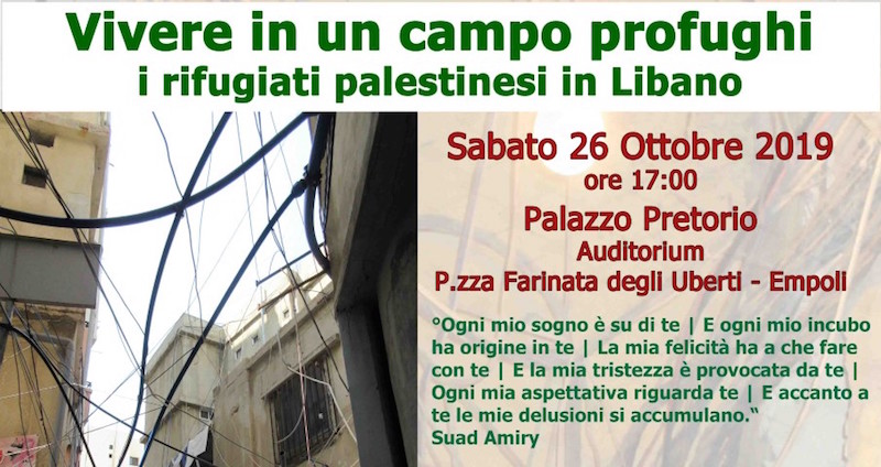 Un evento che porterà il pubblico presente, attraverso immagini e video, in un campo profughi in Libano, guardando senza filtri le reali condizioni dei rifugiati palestinesi, ricordando per mai dimenticare, il massacro di Sabra e Shatila. L’iniziativa denominata “Vivere in un campo profughi: i rifugiati palestinesi in Libano”, è patrocinata dal Comune di Empoli, promossa dalle associazioni Amicizia Italo Palestinese onlus e Assopace Palestina Firenze e si terrà sabato 26 ottobre 2019 alle 17 nell’Auditorium di Palazzo Pretorio, in piazza Farinata degli Uberti.