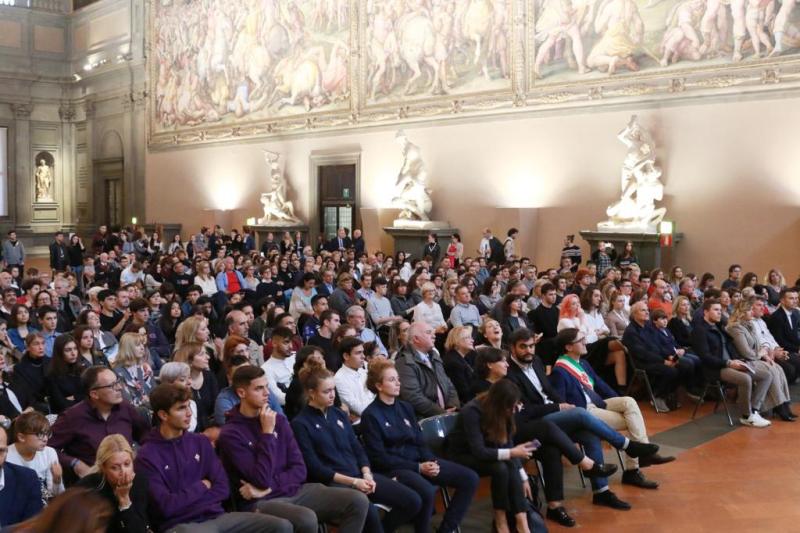 Nell’occasione il sindaco Nardella ha conferito la cittadinanza italiana, su decreto della prefettura, a due ragazzi stranieri, Irena Hoxha e Elion Muca, che hanno giurato sulla Costituzione. I giovani hanno anche ricevuto il regalo della Fiorentina oltre alla copia della Costituzione. Durante la cerimonia sono stati letti dai ragazzi i primi tre articoli della Carta e al termine i giovani hanno visitato liberamente il museo di Palazzo Vecchio che era chiuso al pubblico nel pomeriggio. Ospiti, tutti rigorosamente 18enni, anche quattro atleti dell'Acf Fiorentina: Rebecca Klara Mani e Sofia Lorieri per la Fiorentina women's, per la squadra Primavera Jacopo Gelli e Fabio Ponsi. Nel suo saluto l''assessore Saccardi ha rinnovato l'appello "a donare il sangue", vista la carenza in Toscana.