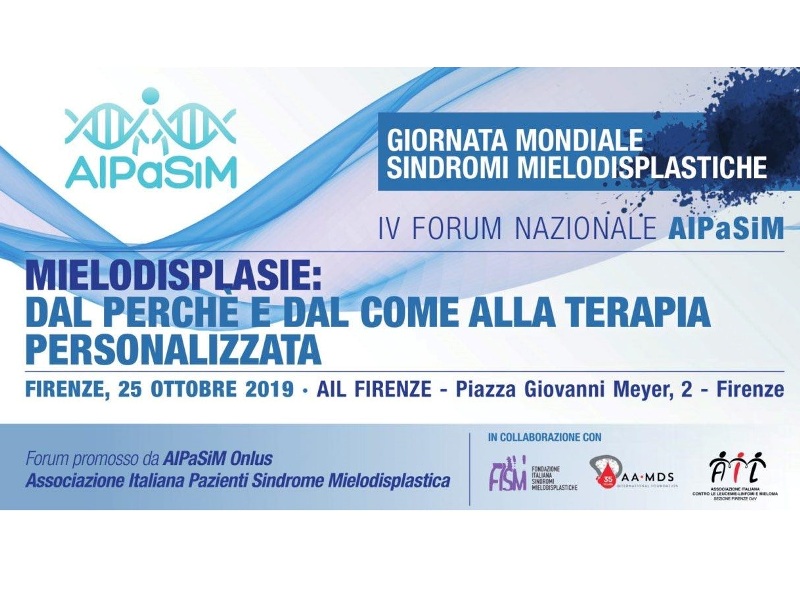 La Giornata Mondiale di consapevolezza della mielodisplasia (MDS), celebrata ogni anno il 25 ottobre in tutti i paesi occidentali e che quest’anno vedrà l’adesione anche della Federazione Russa, sarà ricordata a Firenze grazie ad AIPaSiM – Associazione Italiana dei Pazienti con Sindromi Mielodisplastiche che promuove, in collaborazione con FISiM – Fondazione Italiana Sindromi Mielodisplastiche, AIL – Associazione Italiana contro Leucemie, linfomi e mieloma e AA&MDS - Aplastic Anemia & MDS International Foundation, il IV FORUM “MIELODISPLASIE: DAL PERCHÉ E DAL COME ALLA TERAPIA PERSONALIZZATA”.