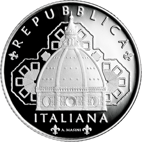 Il dritto della moneta raffigura la splendida cupola realizzata da Filippo Brunelleschi; mentre in secondo piano è rappresentata la planimetria del “trifoglio” delle tribune.