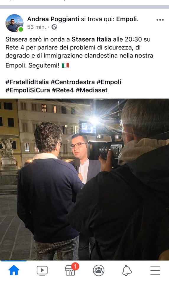 Un servizio costruito ad arte e pieno zeppo di bugie. Si potrebbe riassumere così il passaggio che Rete 4, con la sua trasmissione Stasera Italia, ha fatto sabato sera a Empoli. L'obiettivo del cronista (per giunta empolese) era quello di dire che a Empoli non si vive a causa, manco a dirlo, dei soliti migranti. Un concetto avallato anche da Andrea Poggianti, capogruppo di Fratelli d'Italia in Consiglio comunale e candidato alla poltrona di sindaco alle ultime amministrative, che nel corso del suo breve intervento annunciato attraverso i social, proprio di fronte alla porta della Collegiata, ha sottolineato come, testuali parole, "i migranti più violenti e riottosi vengono messi fuori dai centri profughi, in centro è un far west e non si può vivere nè di giorno nè di notte per le continue risse mentre le periferie sono abbandonate". Per farla breve un servizio di un minuto e mezzo che ha gettato una palata di fango gratuita sulla nostra città basandosi su molte menzogne.