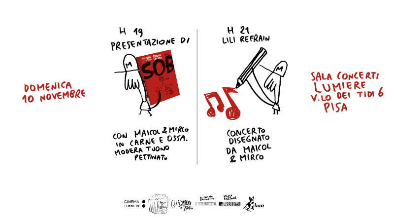 Domenica 10 novembre al Lumiere di Pisa per la rassegna Fumetti&Popcorn arrivano Maicol&Mirco. Un appuntamento speciale che vedrà alle 19.30 gli autori coinvolti nella presentazione di SOB, il secondo volume dell’Opera Omnia de Gli Scarabocchi (Bao Publishing), moderati da Tuono Pettinato e alle 21.30 impegnati in un live drawing sulle note della musicista romana Lili Refrain.