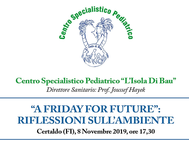 “A friday for future”: riflessioni sull’ambiente è il titolo dell’incontro che si terrà venerdì prossimo 8 novembre, alle ore 17.30, nei locali del Centro Polispecialistico Pediatrico “L’isola di Bau” di Certaldo, diretto dal professore Joussef Hayek.