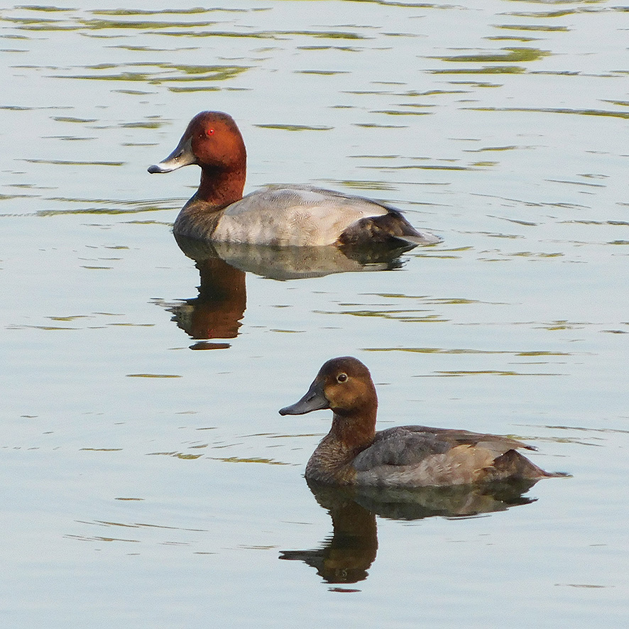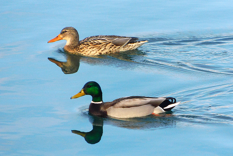 I maschi delle anatre selvatiche, abbandonata la dimessa livrea estiva, si preparano al corteggiamento sfoggiando il piumaggio migliore: spiccano il verde metallico della testa del Germano reale ed il marrone rossastro del capo del Moriglione.