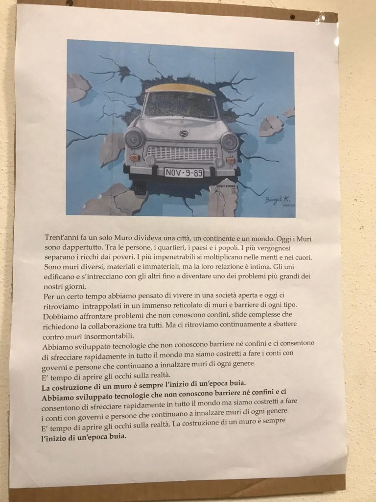 La professoressa Enrichetta Paoli delle scuole medie di Staffoli descrive così il progetto dedicato al 9 novembre 1989: “Trent'anni fa cadeva il muro di Berlino: un evento epocale, ma ancora tutto da scoprire per i ragazzi della terza media e allora ecco l’idea di una lezione creativa: gli alunni sono invitati a portare degli scatoloni di cartone da impilare per ricostruire il muro; l'insegnante di musica, come Rostropovich suonerà Bach con il suo violoncello, mentre la professoressa di motoria ballerà insieme ad alcuni alunni. Si spiegherà l'avvenimento attraverso delle letture e si concluderà il tutto rismontando il muro appena innalzato… almeno quello! Gli studenti infatti sono stati invitati a riflettere sui tanti muri e barriere ancora presenti nel mondo”.