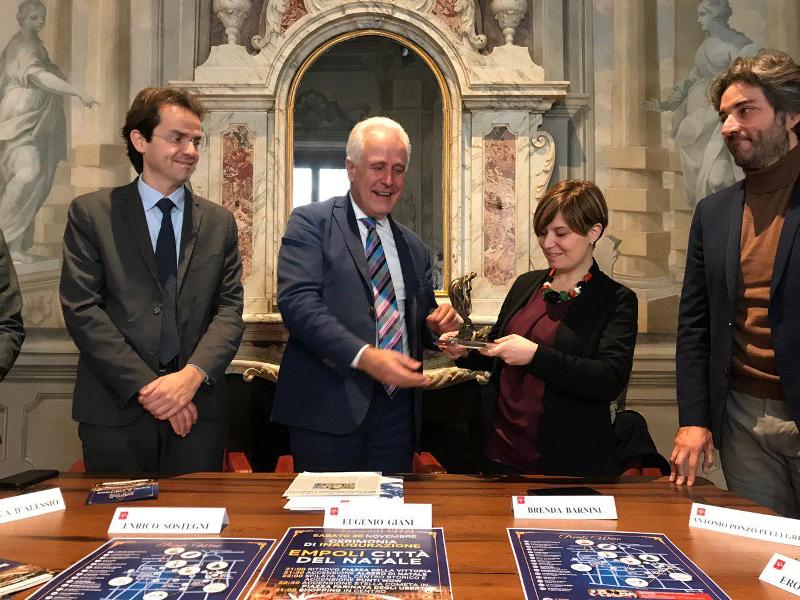 L’idea è quella di trasformare il “Giro di Empoli” in un grande contenitore di emozioni e di messaggi positivi, con la città che indossa l’abito delle grande occasioni: strade, piazze e angoli vestiti a festa, per la gioia di grandi e piccini. La presentazione a palazzo del Pegaso si è chiusa con un ricordo di Cosimo I de’ Medici, ovvero con la statuetta del Consiglio regionale a lui dedicata: la tartaruga con la vela. “La tartaruga rappresenta la solidità della prudenza, la vela la forza del vento che spinge ad andare avanti”, ha affermato Giani, consegnando la scultura a Barnini, per ringraziarla del lavoro svolto.
