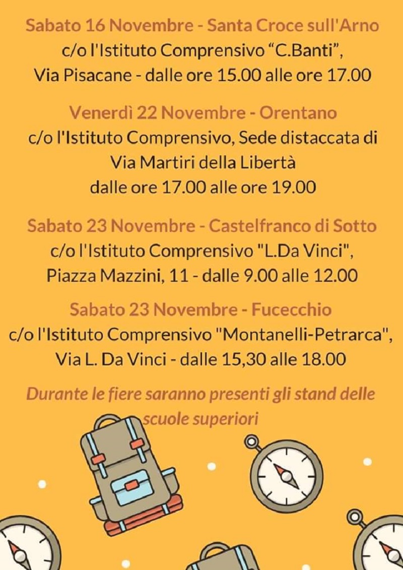 Sabato 23 Novembre alla scuola media Leonardo da Vinci di Castelfranco di Sotto dalle 9 alle 12 mentre il pomeriggio dello stesso giorno alla scuola media Montanelli Petrarca di Fucecchio dalle 15,30 alle 18.