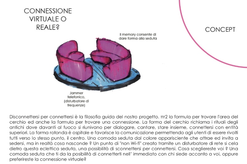 Si tratta di un lavoro collettivo, che ha visto impegnati studenti della Libera Accademia di Belle Arti e iscritti al Design Campus dell’Università degli Studi di Firenze. Partendo dal concetto di “connessione” (tema chiave di questa edizione di Creactivity), i ragazzi hanno ideato un prototipo di seduta pensata per favorire la socializzazione e lo scambio tra individui: una sorta di comodo “sofà urbano” - di forma circolare - da installare in piazze, giardini e spazi pubblici. La disposizione delle persone, tutte rivolte verso il centro, consente ai passanti di guardarsi negli occhi, stabilire connessioni reali e non virtuali, abbandonando per un po’ la tecnologia. La seduta (di colore rosa per richiamare l’attenzione) nasconde infatti al suo interno un “disturbatore di frequenze” in grado di disconnettere gli utenti e incentivare il dialogo e lo scambio diretto. “La forma del cerchio richiama i rituali degli antichi, che davanti al fuoco si riunivano per dialogare, cantare, stare insieme, entrare in contatto con entità superiori - spiega il team -. Cosa scegliereste voi: la connessione virtuale oppure una comoda seduta che ti dà la possibilità di connetterti nell’immediato con chi ti siede accanto?”.