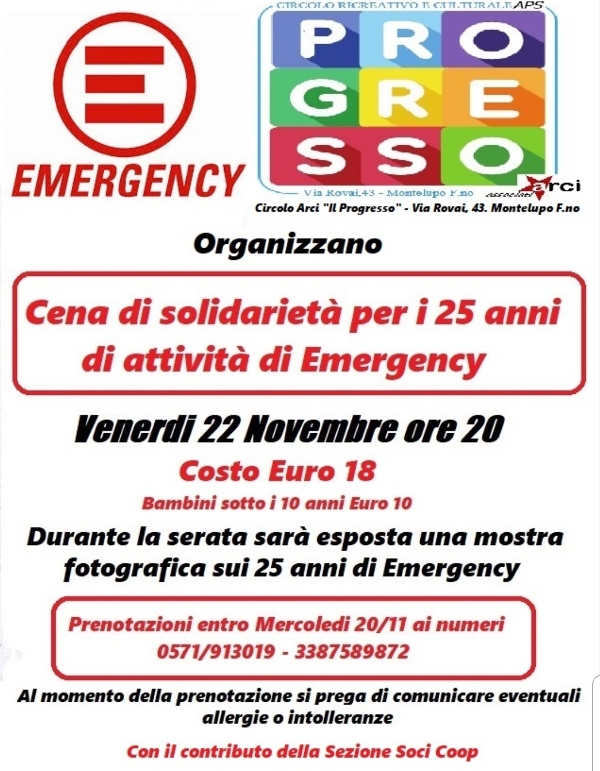 Venerdi 22 novembre il gruppo Emergency Empoli organizza una cena al circolo Arci il Progresso di Montelupo fiorentino.