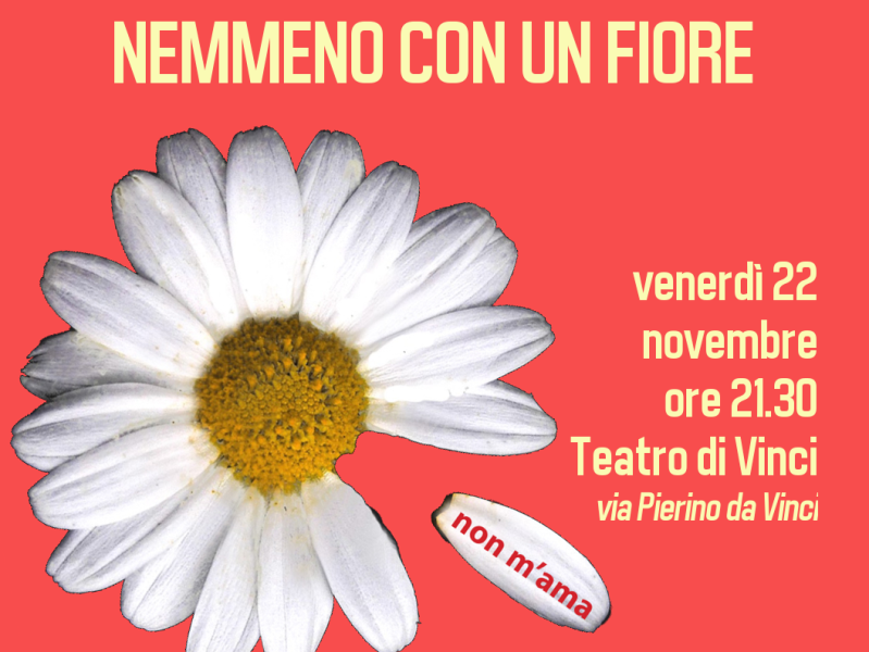 Nell'ambito delle iniziative organizzate in occasione della Giornata Internazionale contro la violenza sulle donne, che si tiene in tutto il mondo il 25 novembre, la Consulta delle Donne di Vinci ha organizzato per venerdì 22 novembre l’evento dal titolo “Nemmeno con un fiore”, presso il Teatro di Vinci, in via Pierino da Vinci 35, alle ore 21.30.
