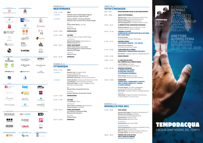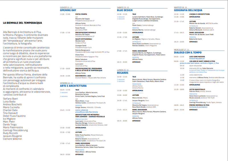 Ricchissimo il calendario degli eventi, lecture e dibattiti che svolgeranno nei giorni della Biennale, agli Arsenali Repubblicani, dal 21 novembre al 1° dicembre prossimo. La Biennale, per espressa volontà del Direttore, esprime una posizione aperta che evidenzia la volontà di porsi in una situazione di dibattito e di confronto, dove l’incontro di esperienze diverse forma l’humus per una riflessione collettiva, estesa e continua, una generazione di significati che dia avvio ad azioni concrete e metta al centro il ruolo dell’architettura nel ripensamento progettuale necessario e urgente per il cambiamento climatico. Questa intenzione si manifesta, particolarmente, attraverso il Premio Biennale di Pisa per il quale è stato proposta e selezionata dalla giuria una short list di progettisti che dimostrano attraverso le loro opera un’originale e significativa interpretazione del tema Tempodacqua.