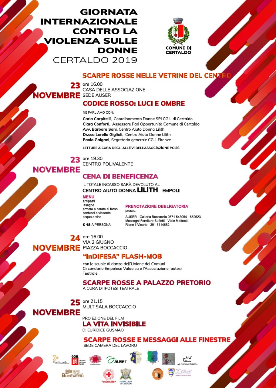 Queste le iniziative in programma: Sabato 23 novembre, ore 16.00, presso la sede Auser alla Casa delle associazioni, viale Matteotti 65. Il dibattito “Codice rosso: luci e ombre”, intervengono: Carla Carpitelli, Coordinamento Donne SPI CGIL di Certaldo; Clara Conforti, Assessore Pari Opportunità Comune di Certaldo; Barbara Sani, Centro Aiuto Donna Lilith; Lorella Giglioli, Centro Aiuto Donne Lilith; Paola Galgani, Segretaria generale CGIL Firenze; letture a cura degli allievi dell'associazione Polis.