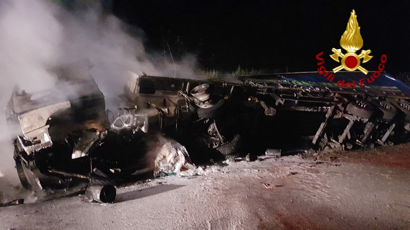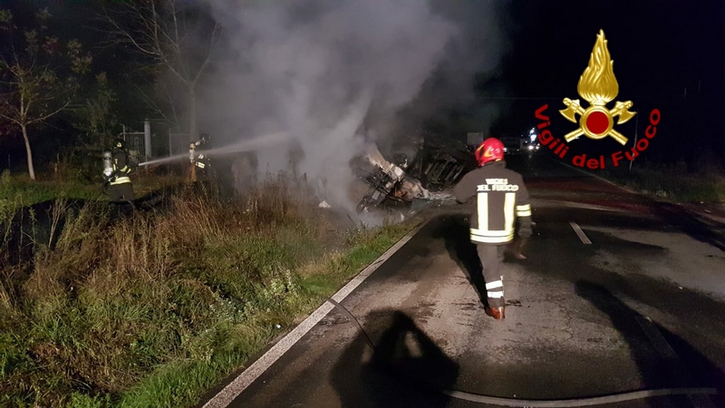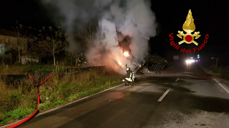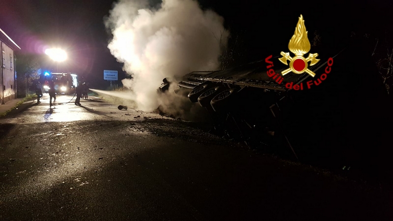 I vigili del fuoco di Arezzo stanno intervenendo con 3 squadre sulla SR 71, all'altezza del bivio per Sitorni, per un incendio autocarro trasportante vernici che ha preso fuoco dopo essersi ribaltato su di un fianco.