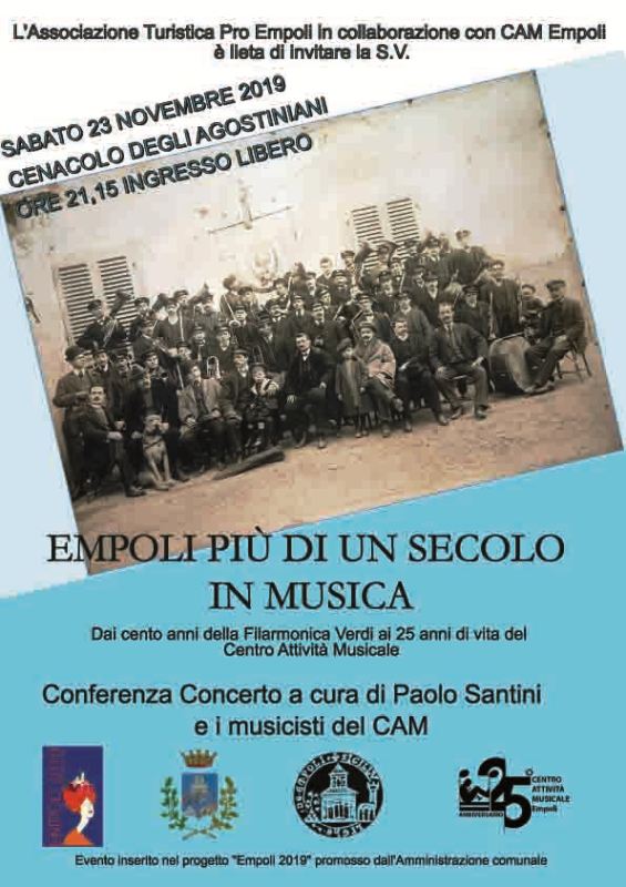 LA CONFERENZA CONCERTO - Sarà l’occasione per ripercorrere gli ultimi centodieci anni di storia musicale empolese anche attraverso l’esecuzione di brani musicali legati ai vari periodi affrontati. Il commento della serata sarà affidato a Paolo Santini; la narrazione scandita dall’esecuzione di una serie di brani musicali – ormai sempre più rari da ascoltare - scelti per l’occasione: in primis grandi classici ma anche qualche sorpresa. Ad eseguire i brani musicali saranno naturalmente alcuni musicisti del Cam, diretti dal maestro Sandro Tani.