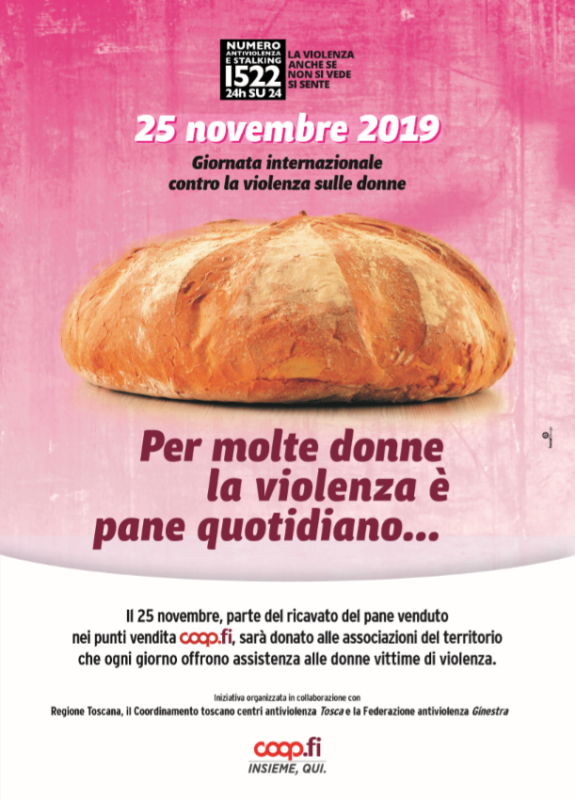 È l’iniziativa di Unicoop Firenze in occasione del 25 novembre 2019, che va in continuità con quanto fatto negli scorsi anni. La novità, rispetto agli incarti delle confezioni di pane con il numero antiviolenza e stalking, attivo 24 ore su 24, 1522 e agli scontrini, è la donazione di parte del ricavato della vendita del pane della giornata del 25 novembre alle associazioni che in Toscana sostengono le donne vittime di violenza. L’iniziativa è organizzata in collaborazione con Regione Toscana, il Coordinamento toscano centri antiviolenza Tosca e la Federazione antiviolenza Ginestra. Quanto verrà raccolto, sarà donato alle associazioni accreditate dalla Regione Toscana e raccolte nell’elenco regionale dei centri antiviolenza e delle case rifugio operanti nel territorio regionale.