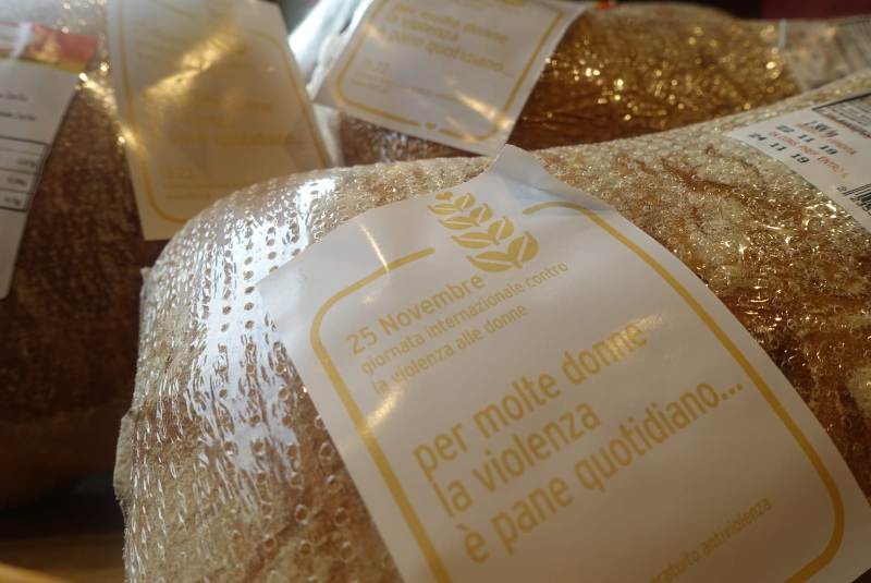 Un bollino sugli incarti per aiutare le donne in difficoltà ricordando il numero unico contro la violenza sulle donne 1522, lo stesso numero riportato sugli scontrini e parte del ricavato della vendita del pane di una giornata devoluto alle associazioni di volontariato.