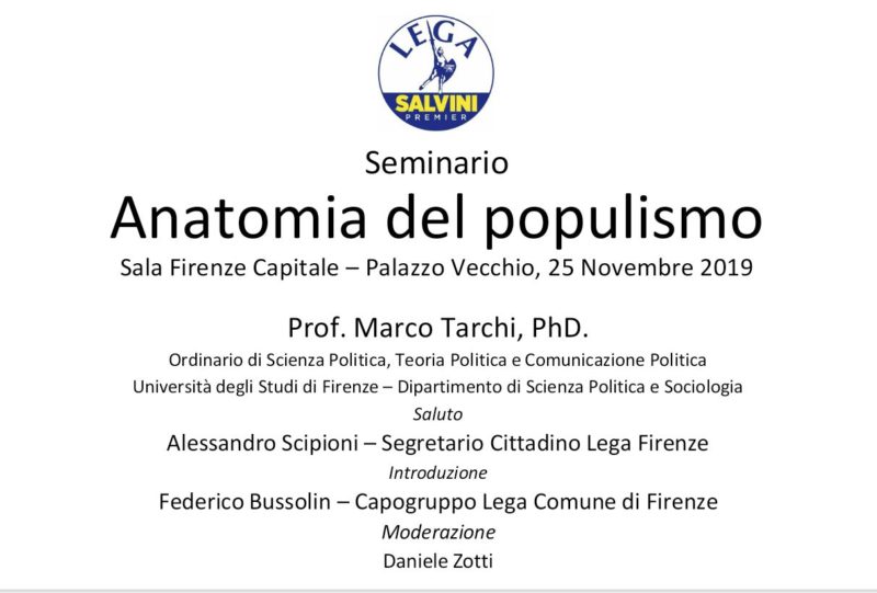 Si tiene questo pomeriggio, a partire dalle 18, nella Sala Firenze Capitale di Palazzo Vecchio il seminario del gruppo Lega Salvini Firenze “Anatomia del populismo”.