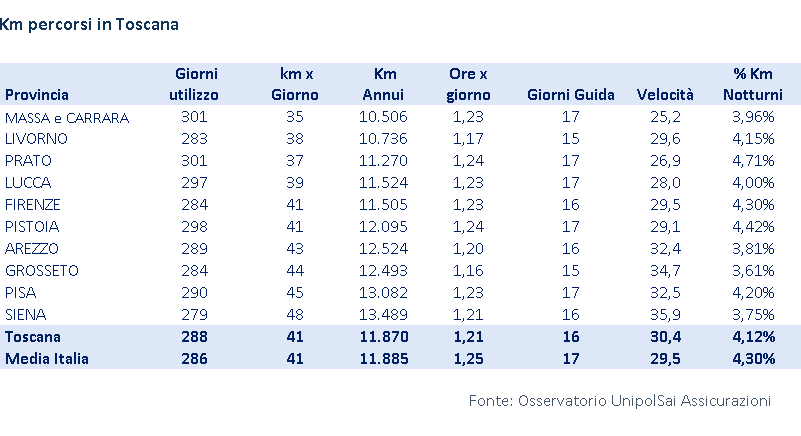 In Toscana si notano differenze notevoli tra le varie province. Siena è al primo posto per km percorsi, con una media di 13.489 km annui e 48 giornalieri, superando la media nazionale rispettivamente di 1.604 e 7 km; subito dopo risulta Pisa, con 13.082 km annui e 45 giornalieri; a seguire, Arezzo (12.524 km annui), Grosseto (12.493), Pistoia (12.095), Lucca (11.524), Firenze (11.505), Prato (11.270), Livorno (10.736) e, a chiudere, Massa e Carrara (10.506).