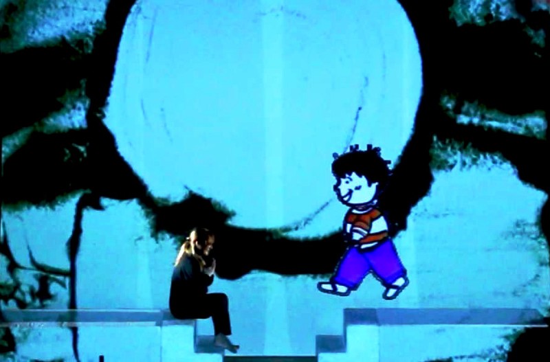 Il mondo dei giochi di un bambino, Olmo, e il suo mondo affettivo popolato da paesaggi e mostri, paesi e animali guida è raccontato da un’attrice, una disegnatrice e un’artista multimediale.