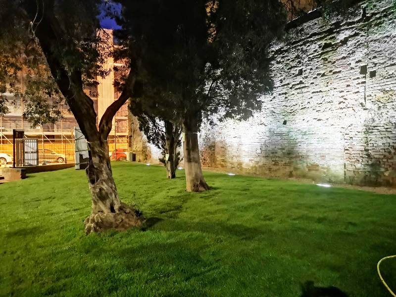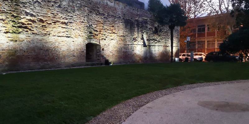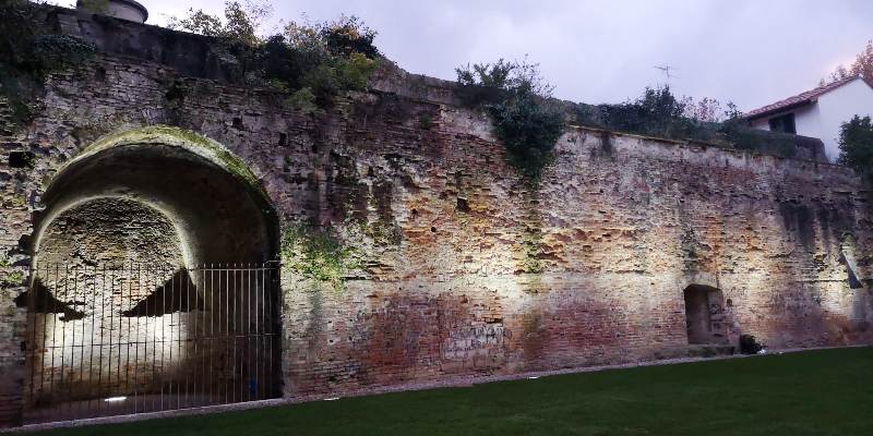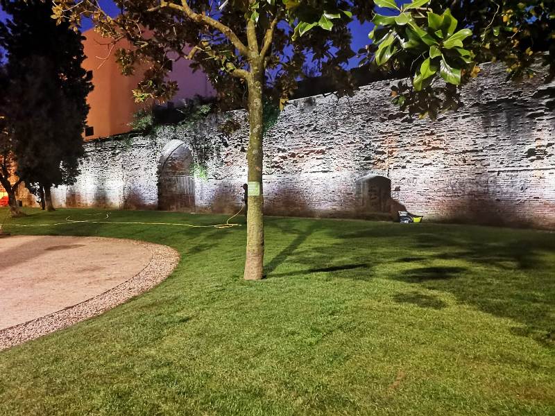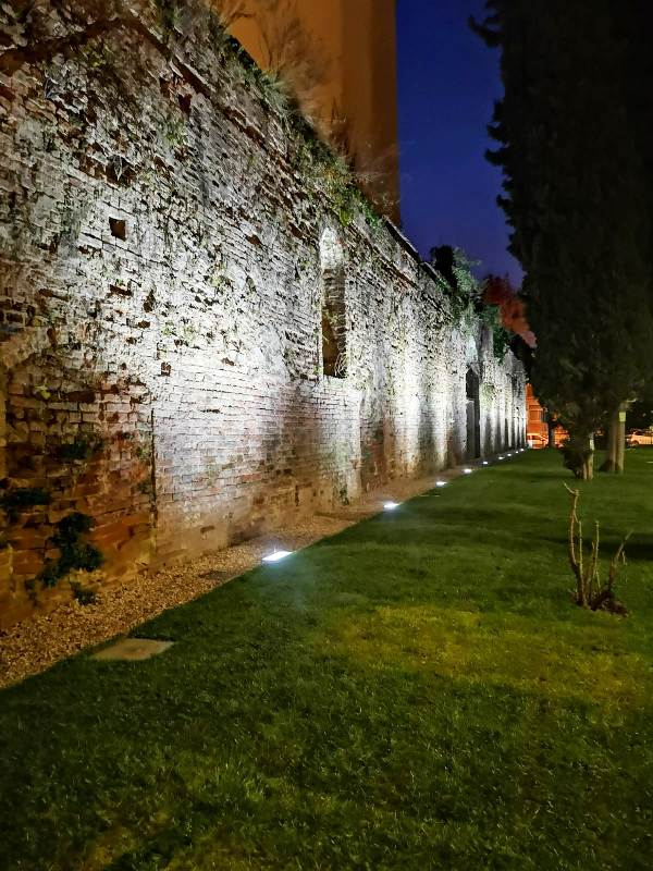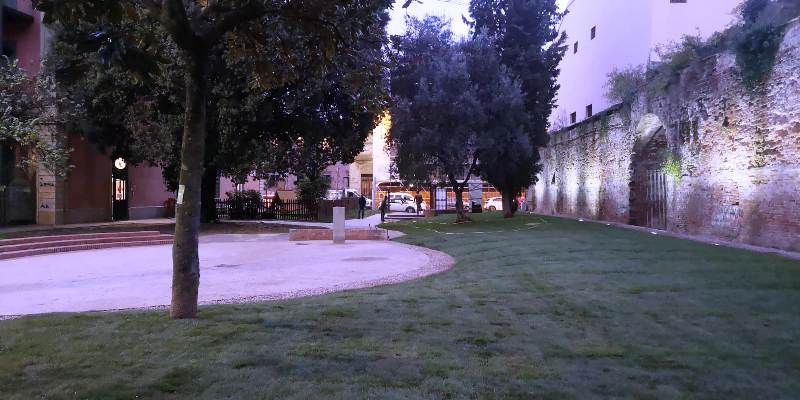 Viene valorizzato il tratto delle mura storiche attraverso una nuova ‘fascia di rispetto’ in ghiaia che corre lungo la parete, con corpi illuminanti a terra, come già avvenuto in Piazza XXIV Luglio. Sarà previsto l’abbattimento di alcune barriere architettoniche e sarà ampliata l’area del piccolo anfiteatro per creare un continuum con la piazza vicina.
