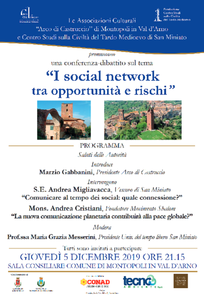Dopo il successo di pubblico della conferenza sulla lingua italiana con particolare riferimento ai linguaggi dei giovani nel tempo del web, le due Associazioni promotrici dell'iniziativa, l'Arco di Castruccio di Montopoli in Val d'Arno e il Centro Studi sulla Civiltà del Tardo Medioevo di San Miniato promuovono un nuovo incontro-dibattito sul tema " I social network tra opportunità e rischi ", con l'intento di favorire una riflessione sull'utilizzo di internet e di altri piattaforme che offrono ampie opportunità di conoscenza, ma al tempo stesso possono determinare occasioni di pericolo soprattutto per le giovani generazioni, ma anche gli adulti in genere. La conferenza si colloca nel più ampio quadro di un ciclo che, a partire dalla realtà della lingua italiana nella dinamicità del suo sviluppo, apra una discussione a tutto campo sul futuro , sul modo più corretto di avvalersi di strumenti capaci di abbattere barriere spaziali e temporali, ma oggettivamente rischiosi quando se ne faccia un utilizzo illimitato e poco critico. Relatori saranno, Giovedì 5 Dicembre 2019 alle ore 21,15 presso la Sala Consiliare del Comune di Montopoli in Val d'Arno, S.E. Andrea Migliavacca, Vescovo di San Miniato e Mons.Andrea Cristiani fondatore del Movimento Shalom, due personalità di spicco del nostro territorio e della Diocesi di San Miniato, ma in particolare capaci di avvicinare i giovani e di aprire con loro un dialogo estremamente costruttivo. A moderare la serata la Professoressa Maria Grazia Messerini, Presidente dell'Universita' del Tempo Libero di San Miniato. Si consolida così la rete di collaborazioni tra Associazioni Culturali, Istituzioni civili e religiose, da considerare una via privilegiata perché si possano affrontare a più voci tematiche di urgente attualità, condividendo energie intellettuali e morali.