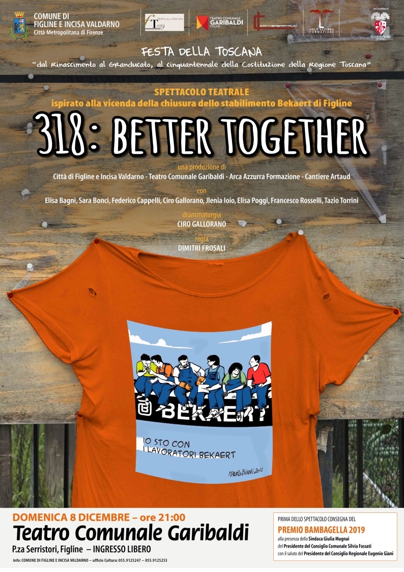 Si tratta della ricorrenza annuale promossa dal Consiglio Regionale, che punta non solo a celebrare l’abolizione della pena di morte (avvenuta nel 1786 a opera del Granduca Leopoldo di Toscana) organizzando un evento pubblico a Firenze il 30 novembre, ma anche promuovendo (e co-finanziando) iniziative e manifestazioni incentrate sul tema dei diritti umani su tutto il territorio regionale, da novembre a febbraio. In occasione della XX edizione, dedicata al tema “Dal Rinascimento al Granducato, al cinquantennale della costituzione della Regione Toscana", il Comune di Figline e Incisa Valdarno ha quindi proposto una riflessione sul diritto al lavoro, partendo proprio dal caso Bekaert, una vicenda territoriale ancora aperta e che ha profondamente colpito l’intera comunità. Lo spettacolo – prodotto dal Comune e realizzato dalle compagnie teatrali Arca Azzurra Formazione e Cantiere Artaud, con il contributo della Città Metropolitana di Firenze e della Presidenza del Consiglio della Regione Toscana - si intitola "318: better together", con chiaro richiamo al claim della multinazionale belga Bekaert che, nel 2016, assorbì lo stabilimento Pirelli di Figline, specializzato in steel cord, per poi annunciarne la chiusura nell’estate 2018 ai suoi 318 dipendenti.