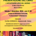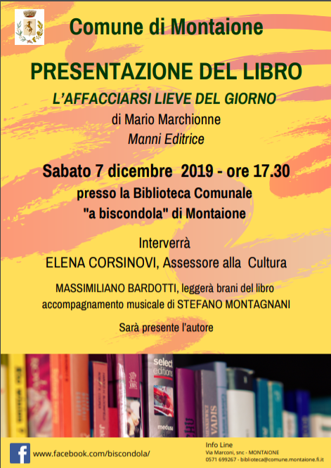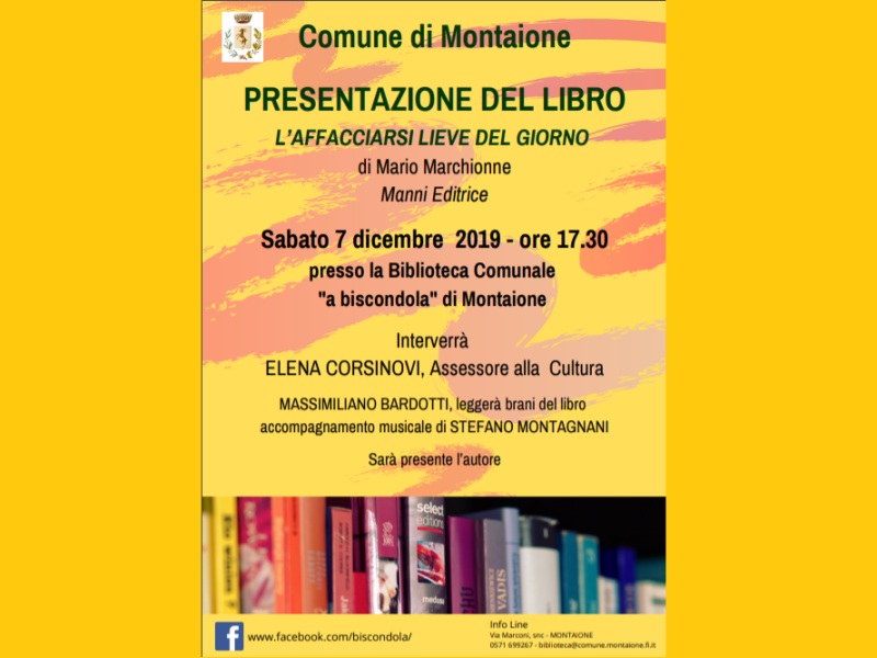 Sabato 07.12.2019, alle ore 17.30, presso la Biblioteca Comunale “a biscondola” , a Montaione, Via Marconi, snc, avrà luogo la presentazione del libro 'L'affacciarsi lieve del giorno', di Mario Marchionne, Manni Editrice, interverrà l’Assessore alla cultura Elena Corsinovi, Massimiliano Bardotti, leggerà brani del libro con l’accompagnamento musicale di Stefano Montagnani, e sarà presente l’autore.