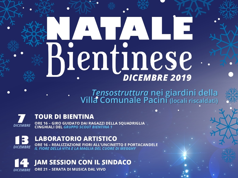 Sabato 7 dicembre la squadriglia “Cinghiali” del Gruppo scout Bientina 1, dalle ore 16.00 alle 17.30, realizzerà un tour dei luoghi artistici e storici del paese; arrivano gli appuntamenti nel parco della villa comunale da venerdì 13 dicembre: alle ore 16.00 ecco il laboratorio di realizzazione di fiori all’uncinetto e portacandele a cura delle associazioni “I fiori della vita” e “La maglia del cuore di Megghy”; Sabato 14 dicembre, ore 21.00, una particolare Jam session; Domenica 15 dicembre, alle ore 13.00, l’associazione “Bientina e il suo Palio” organizzerà in villa comunale il pranzo benefico a cui seguirà alle ore 15.00 un evento di musica con la Caroti & Friends; Giovedì 19 dicembre, alle ore 17.00, al via i laboratori natalizi per bambini a cura della Ludoteca Il Merlino; Venerdì 20 dicembre, ore 17.00, ancora musica con “Provali tutti”, una prova gratuita di strumenti musicali a cura di Backstage Academy; Sabato 21 dicembre, ore 10.00, torneranno di nuovo i laboratori natalizi per bambini a cura della Ludoteca Il Merlino a cui seguirà, alle ore 17.00, un laboratorio per adulti di creazione di ghirlande e altri addobbi natalizi a cura di Elisabetta e Annamaria. Domenica 22 dicembre, ore 16.00, gran finale con l’arrivo di Babbo Natale in villa, a cura dell’associazione fotografica La Torre, nel corso del quale i bambini potranno consegnare le proprie letterine.