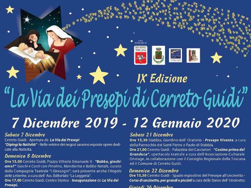 Nel solco di una tradizione ormai consolidata presepi di ogni tipo saranno allestiti nelle vie del centro storico di Cerreto Guidi per un’edizione che senza rinunciare alla sua breve, ma già affermata storia, aggiunge ogni anno sorprese ed elementi di novità. La Via dei Presepi di Cerreto Guidi che si avvale del patrocinio della Regione Toscana, è organizzata dal Comitato promotore, dal Comune di Cerreto Guidi, dall’Associazione CCN Buontalenti, dalla Pro Loco e dalla Parrocchia di San Leonardo, in collaborazione con l’Associazione Italiana Amici del Presepio, le contrade e le associazioni del territorio. La crescita della Via dei Presepi è dimostrata dal numero crescente di visitatori (si stima che lo scorso anno siano stati circa 20mila) e dal suo stabile inserimento nel circuito Terre di Presepi, una rete che unisce i presepi artistici della Regione Toscana.