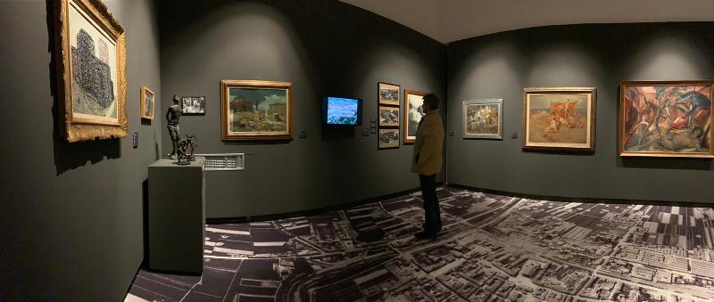 I temi spaziano dalla pittura italiana dell'800, con la rappresentazione accademica del paesaggio ereditata dal Romanticismo fino ad un'idea più contemporanea. Ma, in ordine cronologico e con l'avvento del 900 lo spettatore può immergersi in una nuova visione panoramica, con il Futurismo e attraverso le modifiche storiche, l'invenzione delle città, l'era industriale italiana e la guerra. Quest'ultima provocherà negli uomini e negli artisti un profondo cambiamento interiore, rappresentato nelle sale da un paesaggio che un tempo veniva rappresentato da pennellate fiabesche e naturalistiche, fino alla devastazione, catturata dai fotogrammi e dai nuovi movimenti contemporanei. Proprio secondo quest'ultimo aspetto, nella penultima sala è raffigurata sul pavimento la visione dall'alto di Pontedera bombardata nel maggio del 1944. Lo spettatore si ritrova così catapultato nello scenario suggestivo e distruttivo della seconda guerra mondiale. Infine si arriva giorni nostri, con le installazioni dove il paesaggio è interpretato come elemento di preoccupazione e riflessione per gli esiti delle attività umane.