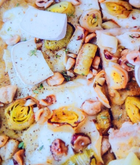 Schiacciata di pane con brie, porri e nocciole