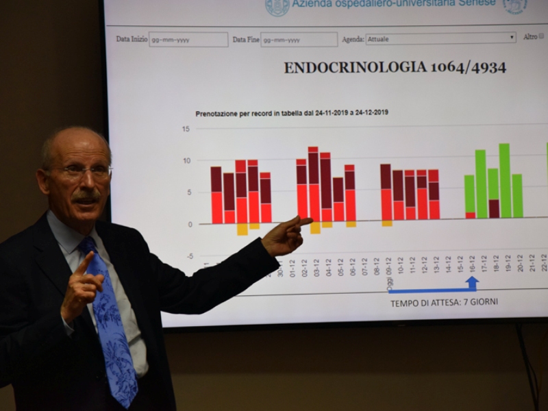 «La vera forza della sanità è dare a ciascuno secondo il suo bisogno ed è quello che abbiamo fatto migliorando le liste e i tempi di attesa per le attività specialistiche e di ricovero chirurgico». Così Valtere Giovannini, direttore generale dell’Azienda ospedaliero-universitaria Senese, durante la presentazione dei dati 2019 sul lavoro fatto sul tema liste di attesa. «Sono risultati importanti, frutto di un grande lavoro di squadra tra tanti professionisti e con la fondamentale collaborazione dell’Università di Siena e il sostegno della Regione Toscana. Non abbiamo aumentato l’offerta ma abbiamo cambiato la disposizione in campo dei nostri professionisti, costruendo un’organizzazione nuova e un team dedicato, verificando ogni giorno qual è il bisogno dei cittadini e offrendo quindi quotidianamente risposte tarate sul reale bisogno delle persone, perché a bisogni diversi è necessario dare risposte diverse. Abbiamo diversificato le agende – prosegue Giovannini - separando i percorsi tra primo accesso e visita di controllo, abbiamo attivato front office dedicati al cittadino, abbiamo studiato tutte le richieste di prestazioni provenienti dai medici di medicina generale della zona senese e dalla provincia, abbiamo cercato di capire i fenomeni e trovare risposte diverse rispetto al passato. È un lavoro importante con un’organizzazione dedicata ma che ci riempie il cuore perché, ad un anno dall’avvio del progetto, possiamo garantire risposte concrete ai cittadini e continueremo a lavorare per migliorare». Le prestazioni per le quali l’Aou Senese garantisce il rispetto dei tempi dettati dal Piano Regionale del Governo delle liste di attesa e, in particolare, assicura una prima visita entro una settimana dalla richiesta sono visita cardiologica, chirurgica generale, dermatologica, oncologica, neurologica, endocrinologica, urologica, otorinolaringoiatrica, ortopedica, ginecologica, oculistica, gastroenterologica. Per le prestazioni diagnostiche: TAC del rachide e dello speco vertebrale, Tac del capo senza e con mezzo di contrasto, Tac dell’addome, Tac dell’addome inferiore, Tac torace, mammografia bilaterale, ecografia ostetrica, ecografia della mammella bilaterale, RMN dell’encefalo e del tronco encefalico, elettrocardiogramma, ecografia dell’addome.