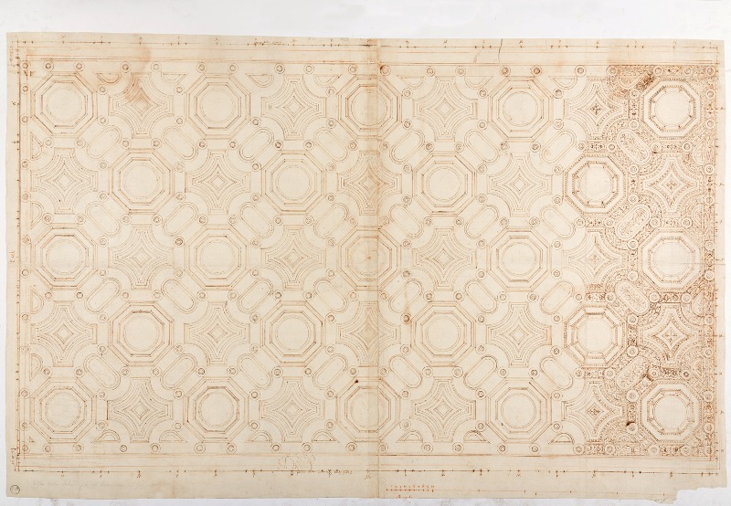 Questo magistrale disegno custodito agli Uffizi, raramente esposto (formato da due fogli congiunti che compongono la proiezione ortogonale della maestosa volta) forniva agli artigiani le modalità costruttive per la combinazione di astroidi, ovati e ottagoni.